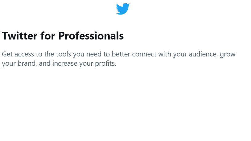 The link led to a pop-up to get started with the message, “Twitter for Professionals: Get access to the tools you need to better connect with your audience, grow your brand, and increase your profits.”