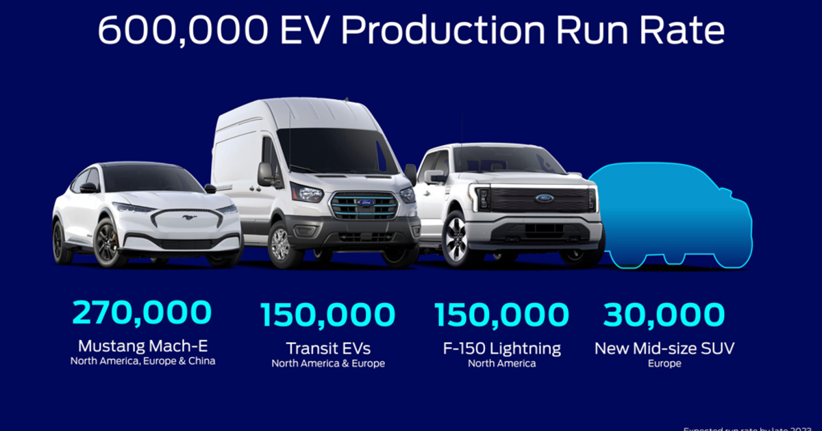 Ford for the first time Thursday broke down how it plans to reach 600,000 EVs by next year: 270,000 Mustang Mach-Es for North America, Europe and China; 150,000 F-150 Lightnings for North America; 150,000 Transit EVs for North America and Europe; and 30,000 units of a new SUV for Europe.